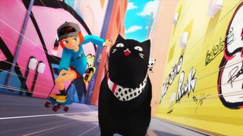 ポップなグラフィティあふれる裏路地を、スケボー少女"MOMOCO"と黒猫が駆け抜けます。